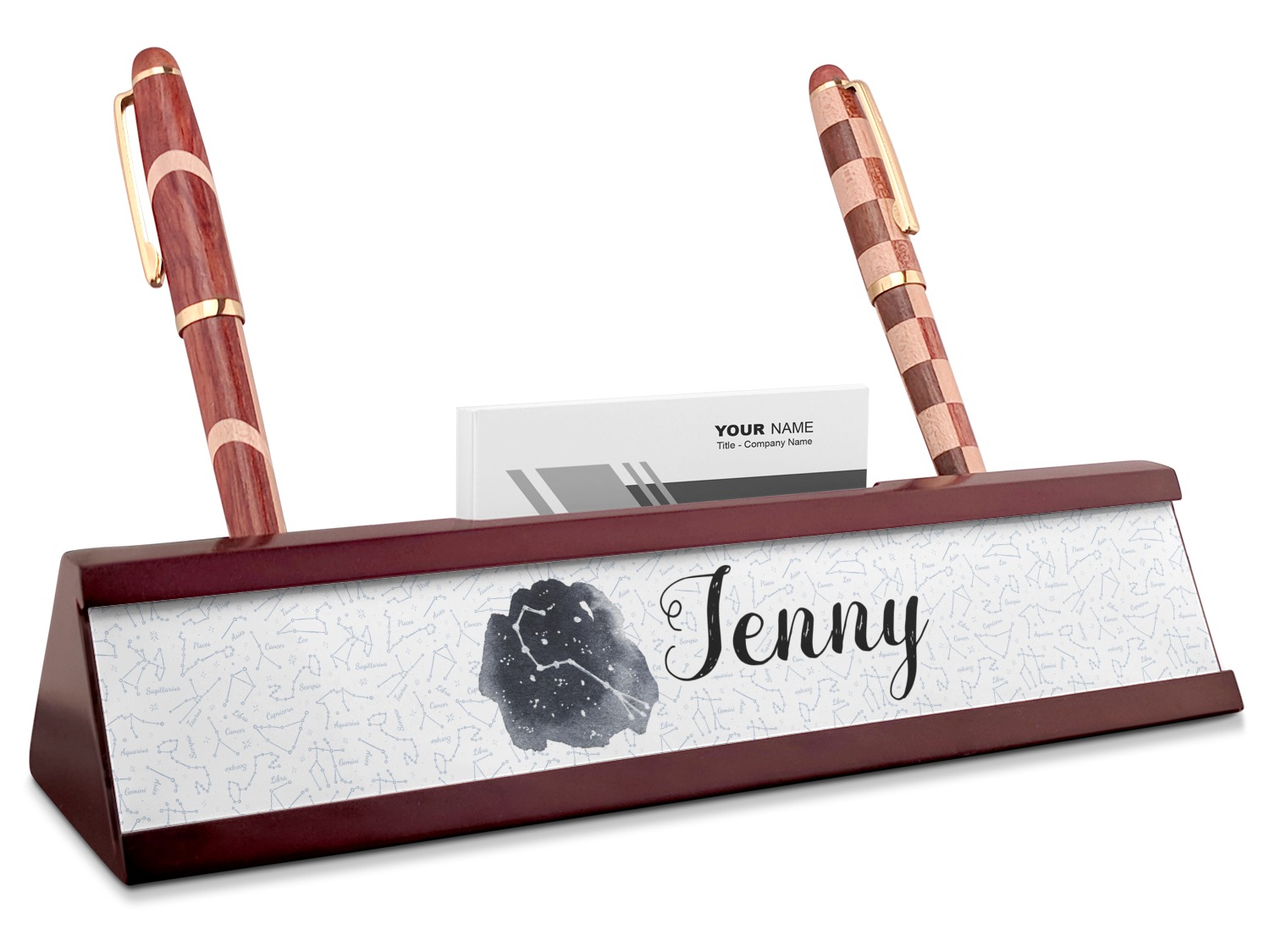 Your desk name plates are crafted from a high-quality, dark-cherry mahogany. At approximately 9.5 by 1.875 by 2.5 inches, this name plaque will fit perfectly, front and center, on your desk. Your customization spans across the entire face of the nameplate. Behind the nameplate lies a skinny slot that can fit approximately 15, traditionally-sized, business cards. You can also store your writing utensils on either side of this custom desk name plate.