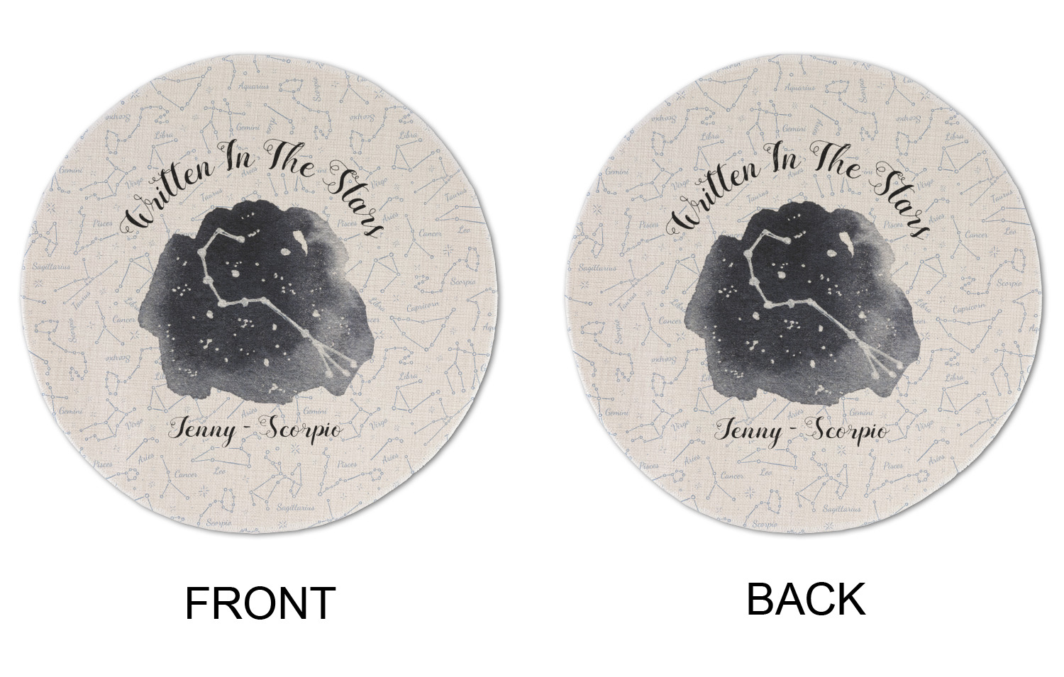 This design features a simplistic white and light blue background that has all of the zodiac constellations. The focal point of the design is your very own zodiac constellation surrounded by a sea of dark blue. It looks as if you are peeking into the night sky. Around this graphic is where you can put a phrase of your choosing and your personalization.