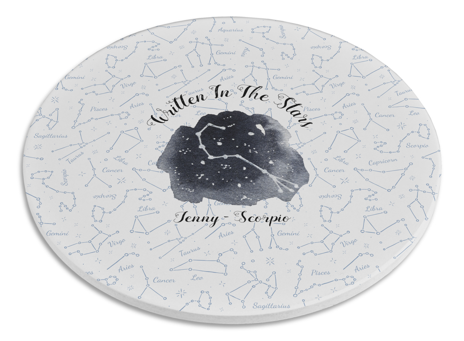 This design features a simplistic white and light blue background that has all of the zodiac constellations. The focal point of the design is your very own zodiac constellation surrounded by a sea of dark blue. It looks as if you are peeking into the night sky. Around this graphic is where you can put a phrase of your choosing and your personalization.