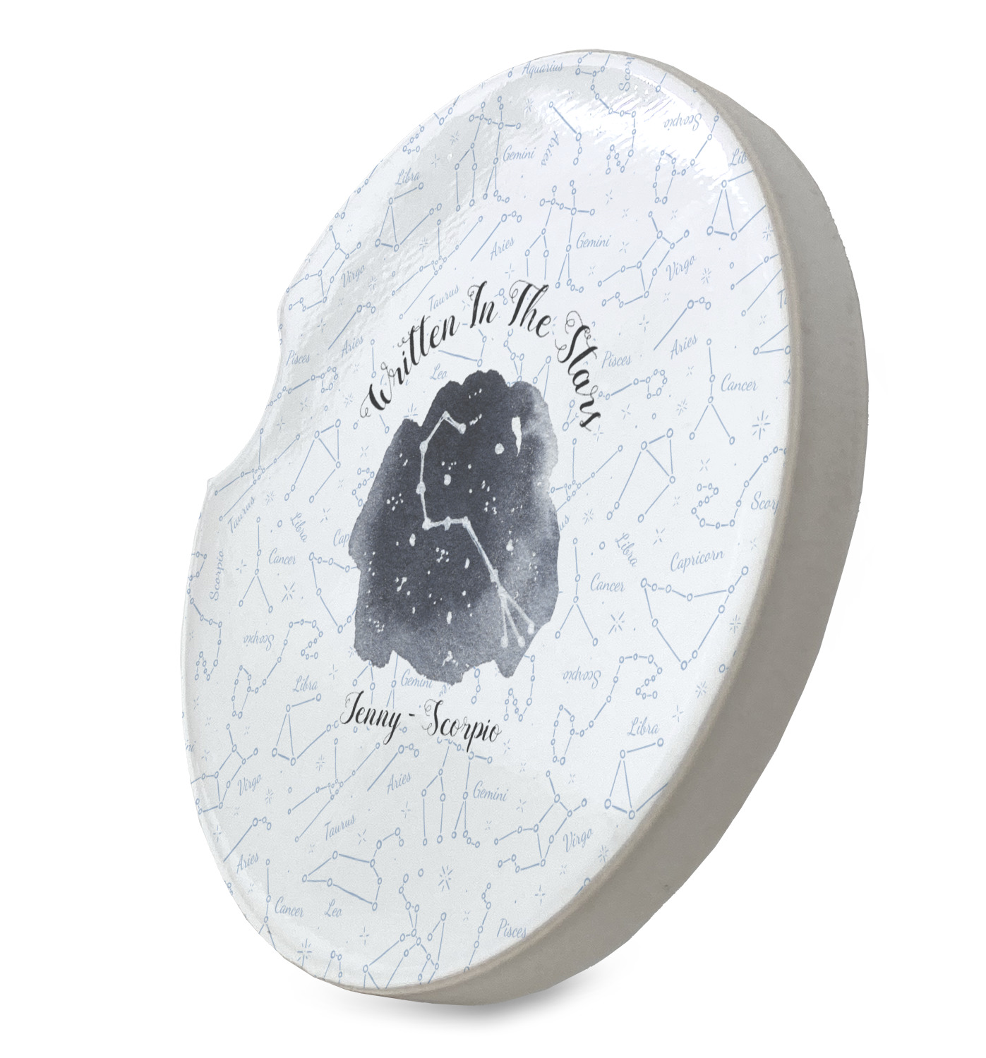 This design features a simplistic white and light blue background that has all of the zodiac constellations. The focal point of the design is your very own zodiac constellation surrounded by a sea of dark blue. It looks as if you are peeking into the night sky. Around this graphic is where you can put a phrase of your choosing and your personalization.