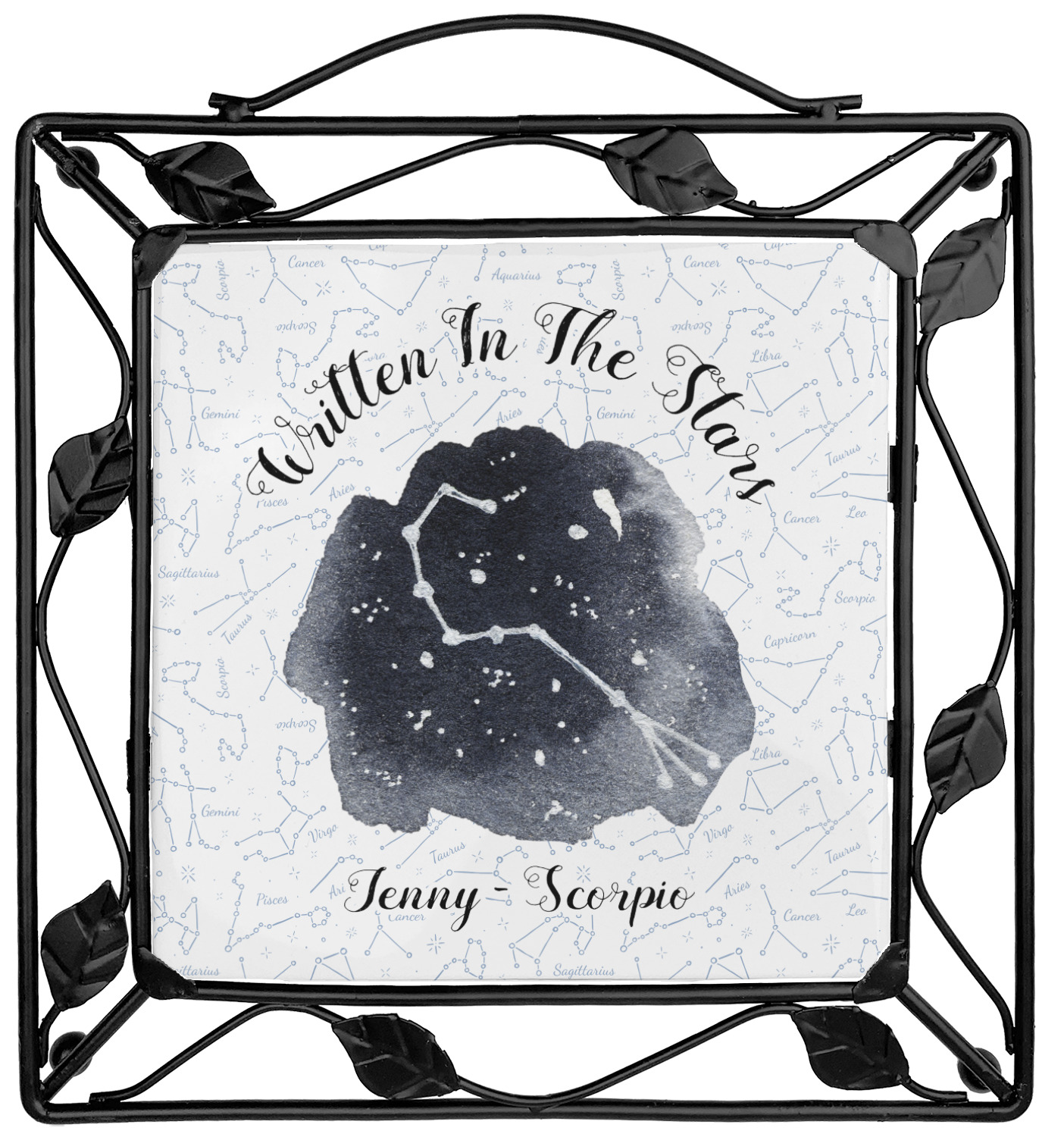 Our square trivets are made from a durable, wrought iron. This model features 4 small half circles, one on each corner, and a larger ring of iron that circles the central, customized tile. Each of the 4 corners has a round foot on its bottom for stability. This trivet is 8.75 by 8.75 inches, but the central tile measures at 6 inches on both sides.
