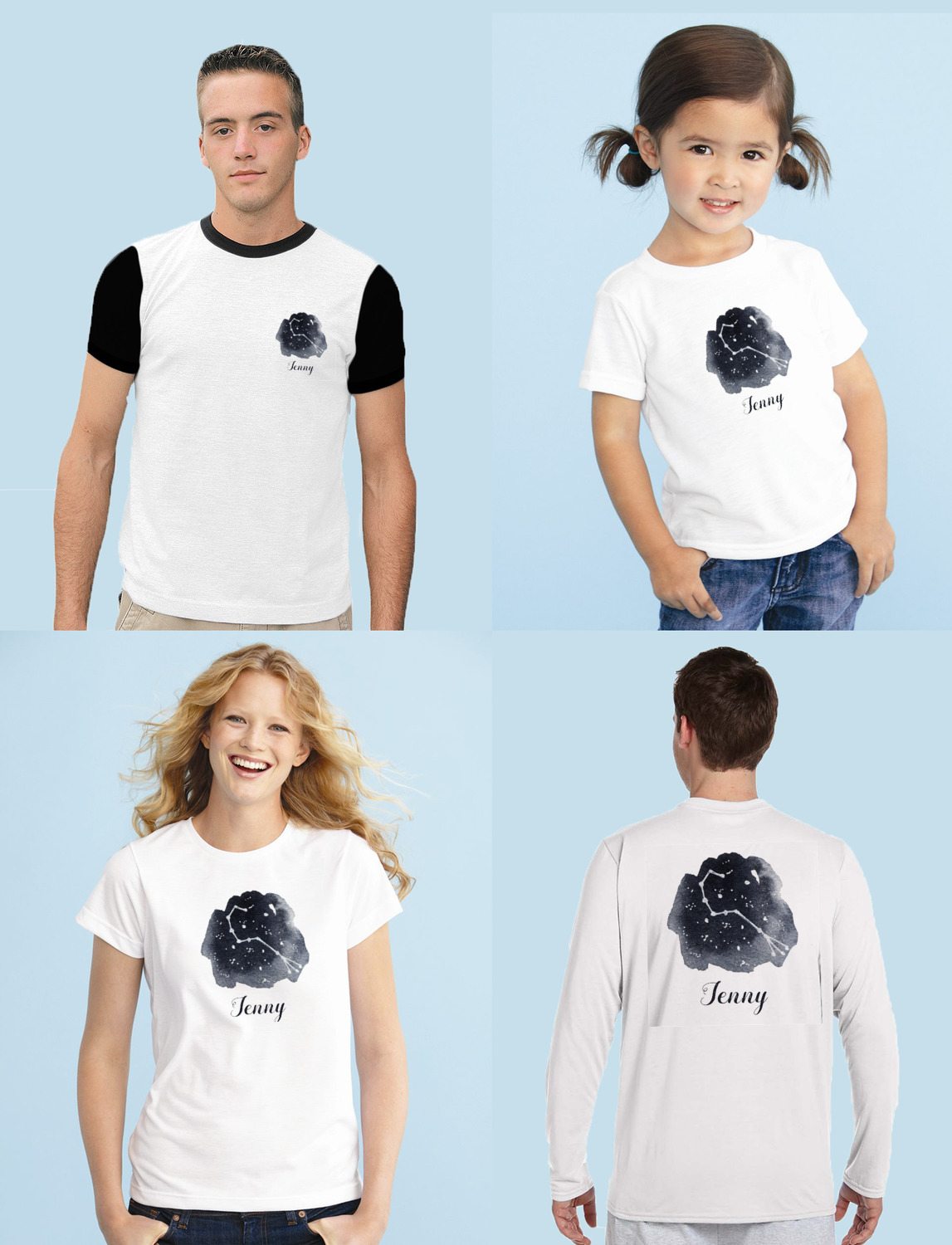This design features a simplistic white and light blue background that has all of the zodiac constellations. The focal point of the design is your very own zodiac constellation surrounded by a sea of dark blue. It looks as if you are peeking into the night sky. Around this graphic is where you can put a phrase of your choosing and your personalization.