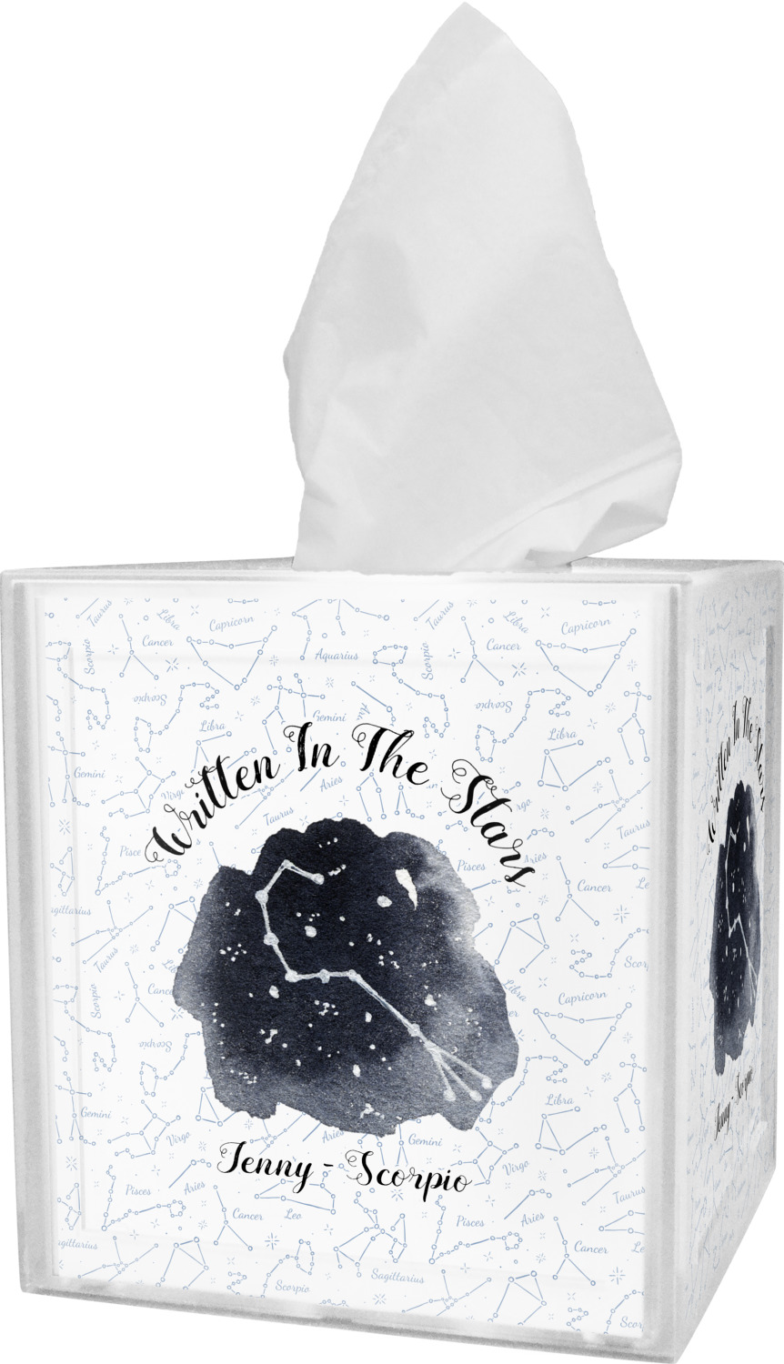 These tissue holders are built from durable acrylic and display your unique personalization on fine-quality vinyl inserts placed within the four sides and top. The box features two pieces, allowing you to easily switch out tissue boxes. On the sides, youll find ridges that ensure the top and base fit securely in place. The bottom of these tissue box holders has four, rubber, non-slip pads to prevent the box from scuffing any surface you decide to display it on. Each box can fit a standard 5 by 5-inch box of tissues.