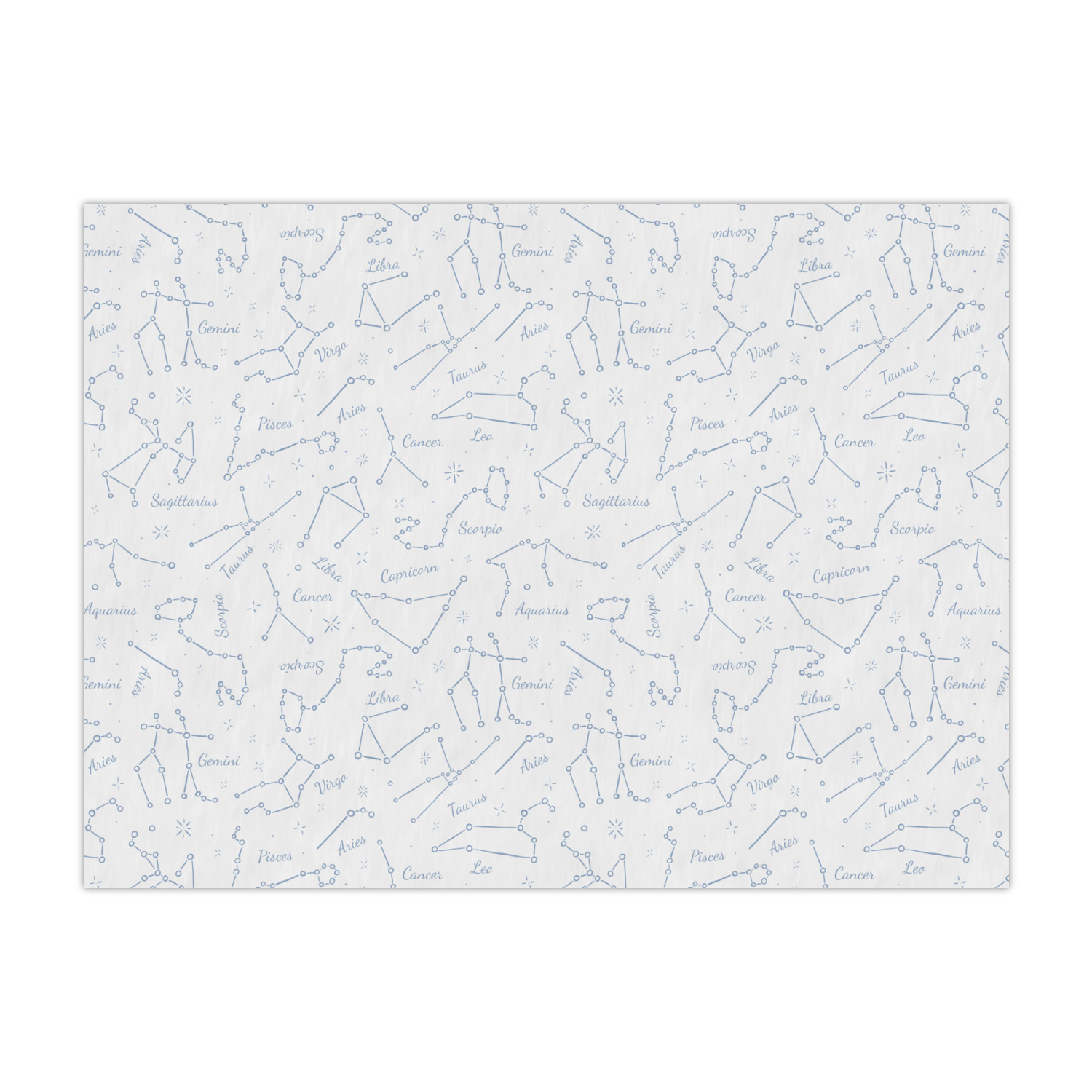 This design features a simplistic white and light blue background that has all of the zodiac constellations. The focal point of the design is your very own zodiac constellation surrounded by a sea of dark blue. It looks as if you are peeking into the night sky. Around this graphic is where you can put a phrase of your choosing and your personalization.