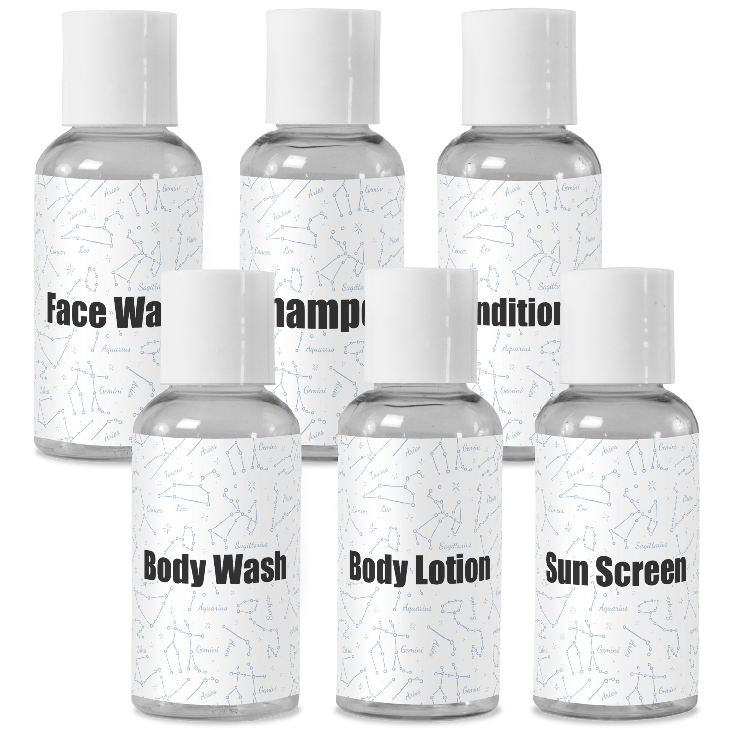 These soap and lotion travel bottles are the perfect place to start. Each set comes with 6 clear plastic bottles with white pop top lids. The bottles are cylindrical and can hold approximately 2.7oz. Perfect for plane travel!