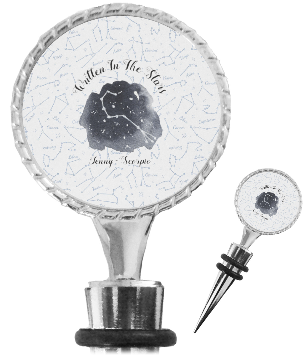 The top part of your bottle stopper is comprised of a zinc ring that displays your customization(s) in its middle, on both sides. The ring is heavy duty, with a bright chrome finish. The body of the wine stoppers have two silicone rings to provide an airtight seal. These wine bottle stoppers measure at 1.625" L x 0.8125" W x 4.625" H; your custom wine stopper is meant to fit into most standard-sized wine bottles.