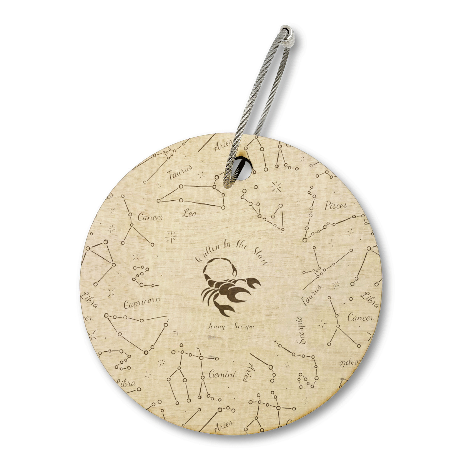 This design features a simplistic white and light blue background that has all of the zodiac constellations. The focal point of the design is your very own zodiac constellation surrounded by a sea of dark blue. It looks as if you are peeking into the night sky. Around this graphic is where you can put a phrase of your choosing and your personalization.