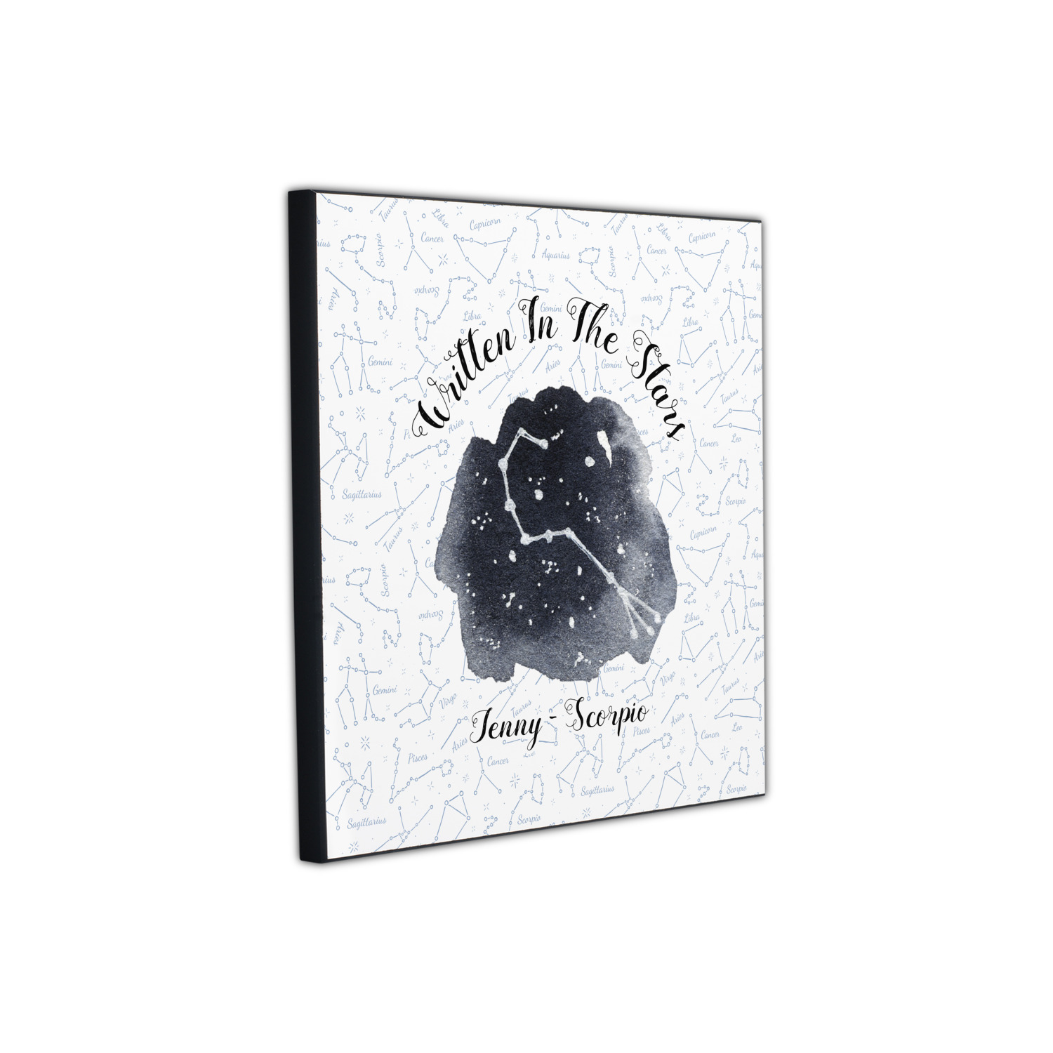 This design features a simplistic white and light blue background that has all of the zodiac constellations. The focal point of the design is your very own zodiac constellation surrounded by a sea of dark blue. It looks as if you are peeking into the night sky. Around this graphic is where you can put a phrase of your choosing and your personalization.