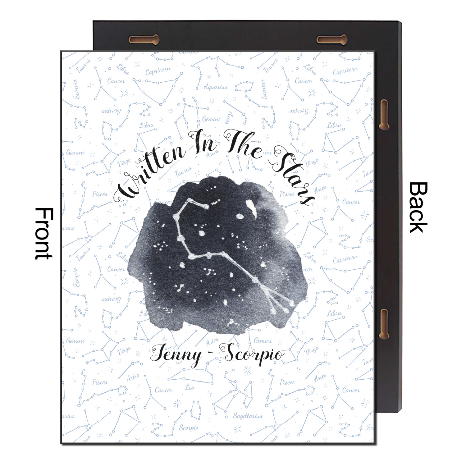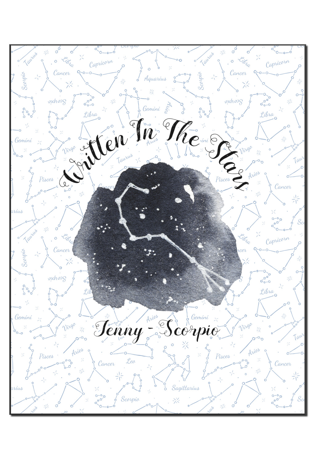This design features a simplistic white and light blue background that has all of the zodiac constellations. The focal point of the design is your very own zodiac constellation surrounded by a sea of dark blue. It looks as if you are peeking into the night sky. Around this graphic is where you can put a phrase of your choosing and your personalization.