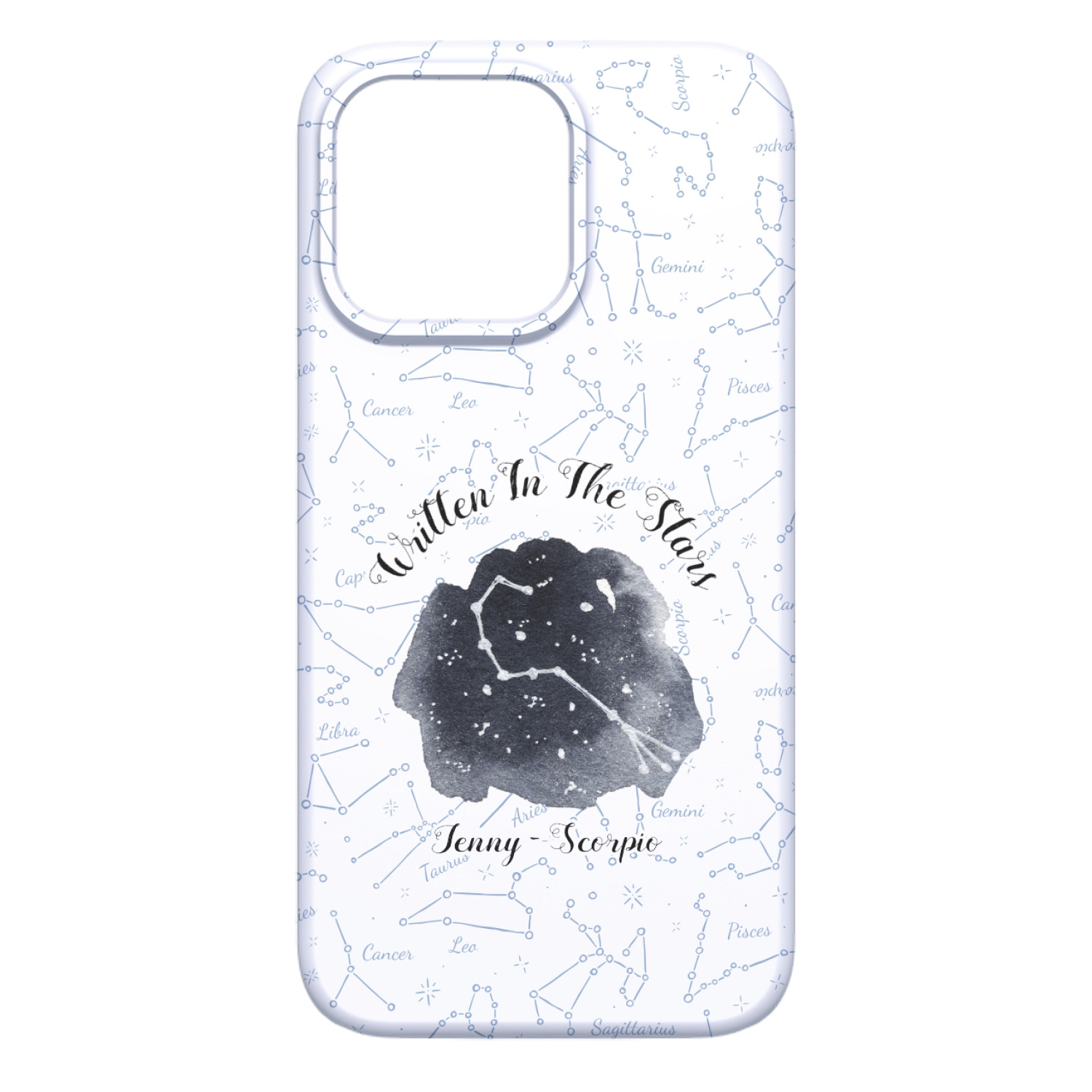 This design features a simplistic white and light blue background that has all of the zodiac constellations. The focal point of the design is your very own zodiac constellation surrounded by a sea of dark blue. It looks as if you are peeking into the night sky. Around this graphic is where you can put a phrase of your choosing and your personalization.